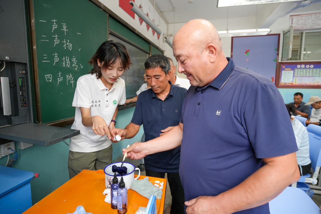 本次培训的一大亮点,是实践团成员将国家通用语言文字学习与中华优秀传统文化体验深度融合,营造出“知识性与趣味性”并重的学习氛围。培训特别开设了扎染体验课、五色丝线编织课等文化实践课程。教师们在动手操作过程中,自然而然地学习和运用“浸染”“纹样”“对称”“编织”“中华优秀传统文化”等相关专业词汇与表达,将抽象的语言学习转化为生动的文化体验。这种“做中学、学中乐、乐中获”的创新模式,极大激发了教师们的学习热情和参与积极性,让培训效率和质量得到显著提升。