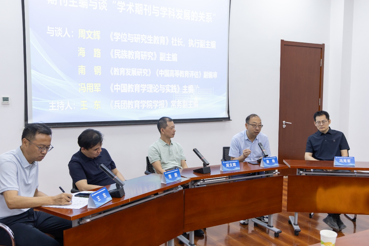 《学位与研究生教育》杂志社社长、执行主编周文辉,《民族教育研究》副主编海路,《教育发展研究》《中国高等教育评估》副编审南钢,《中国教育学理论与实践》主编冯用军,围绕“学术期刊如何助力西部教育学科发展”展开对话,石河子大学教育学科教师参与会谈。此次对话强调,教育研究要立足西部教育学科的区域特色,聚焦教育实践突出问题,推动教育实践与研究成果双向良性互动。