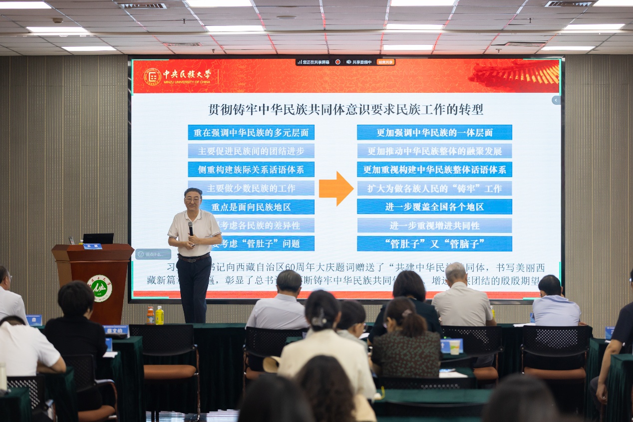 中央民族大学教育学院原院长苏德教授作了题为“聚焦铸牢主线 加强民族地区中华民族共同体建设”的报告。苏德教授强调,完整准确全面理解把握新时代党的民族工作的新理论、新思想是民族工作的思想基石,要结合西部多民族地区的教育实际,贯彻铸牢中华民族共同体意识,促进民族工作的转型。