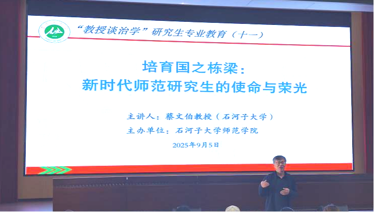 为引导师范学院研究生明确使命担当、涵养教育情怀,学院于2025年9月5日在石河子大学南山新校区师范学院一楼学术报告厅成功举行“教授谈治学”研究生专业教育第十一场讲座。本次讲座特邀蔡文伯教授主讲,以“培育国之栋梁:新时代师范研究生的使命与荣光”为主题,研办主任范树花老师主持,2025级全体研究生参加。